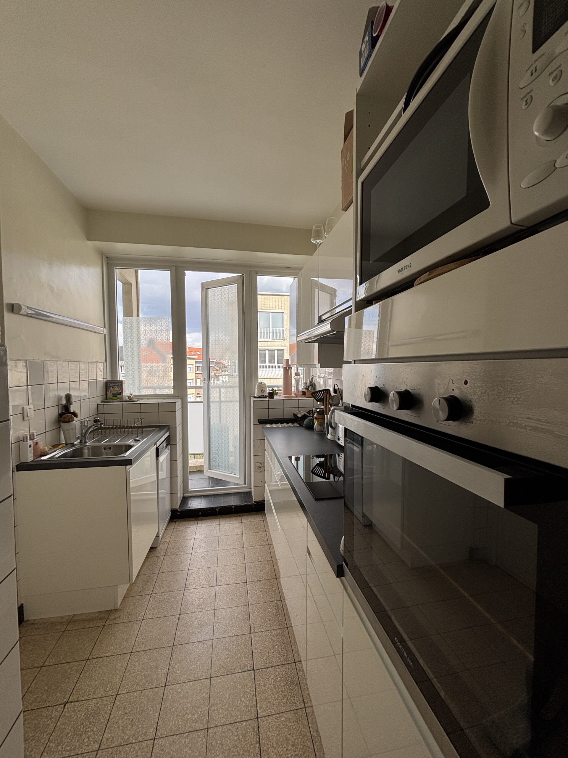 L’appartement se compose d’un grand hall d’entrée avec porte blindée, un séjour lumineux avec terrasse et nouvelle cuisine équipée. A l’arrière, deux chambres à coucher avec salle de bains et toilette séparée – Charges 225€/ mois (chauffage, eau chaude et charges batiment). PEB D